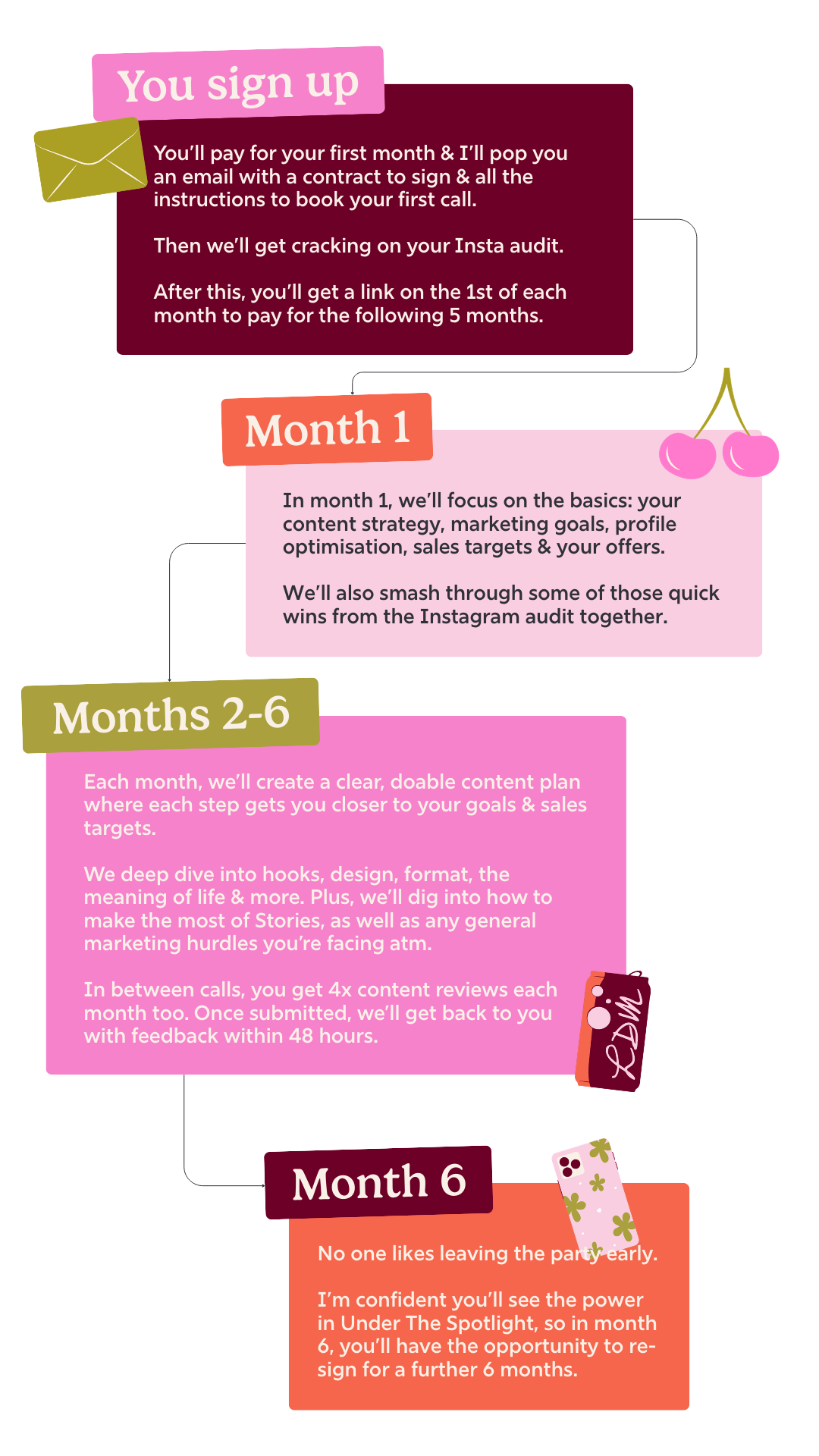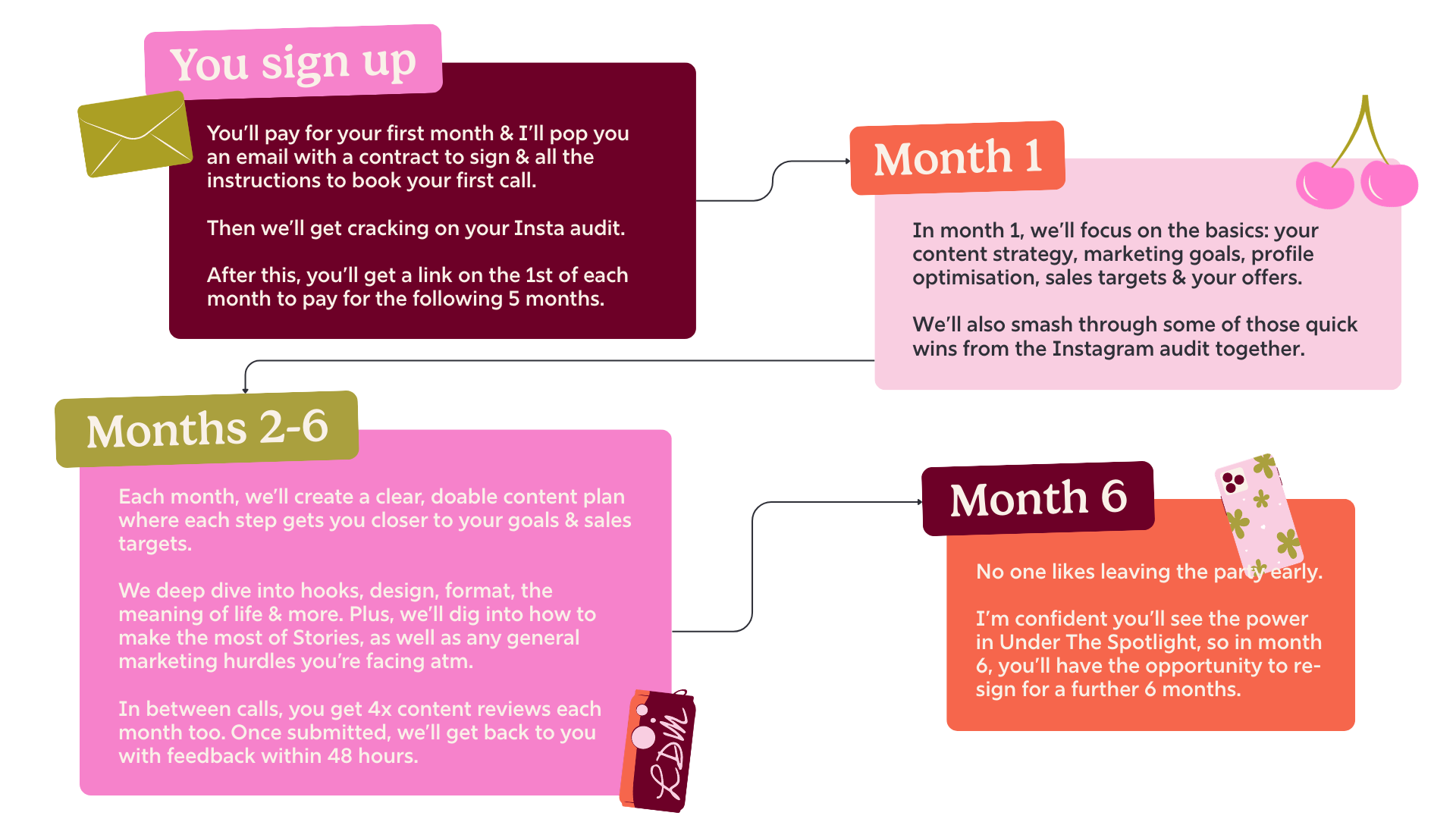 Month 1 focuses on the basics, so weβll look at strategy, offers, messaging + more to get you ready for dreamy content in month 2 onwards.